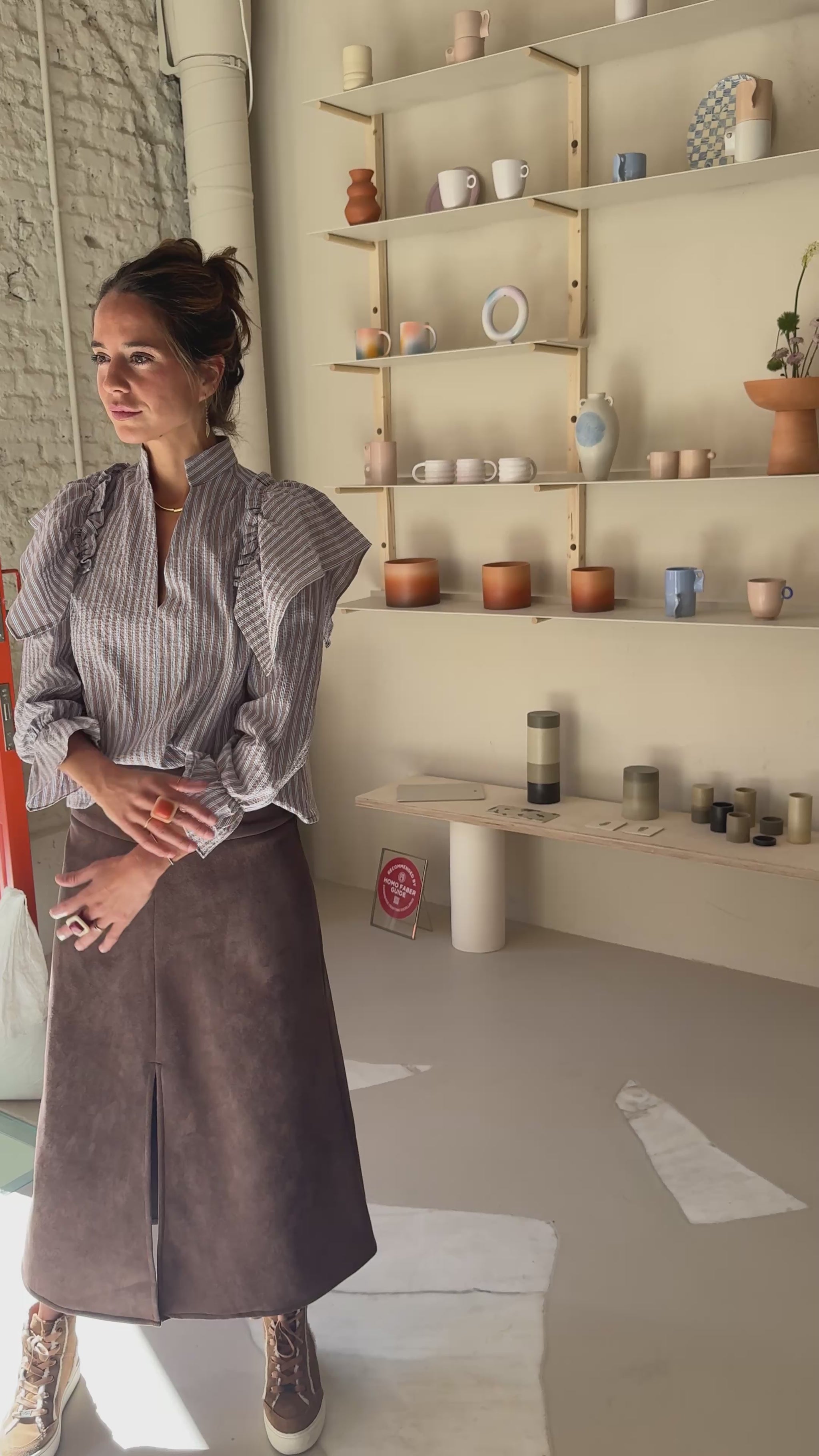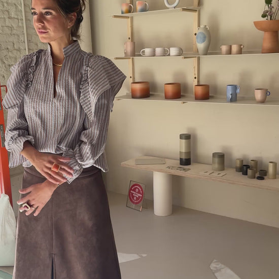Camisa fruncida desde el hombro, con cuello mao y con dos alerones cosidos con pestaña.  Tiene una costura central delantera, canesú en la espalda y la manga larga que se remata con un volante. Está confeccionada en un tejido de sersúker de rayas topos y azules,  muy cómodo ya que no se arruga y casi no necesita plancha.