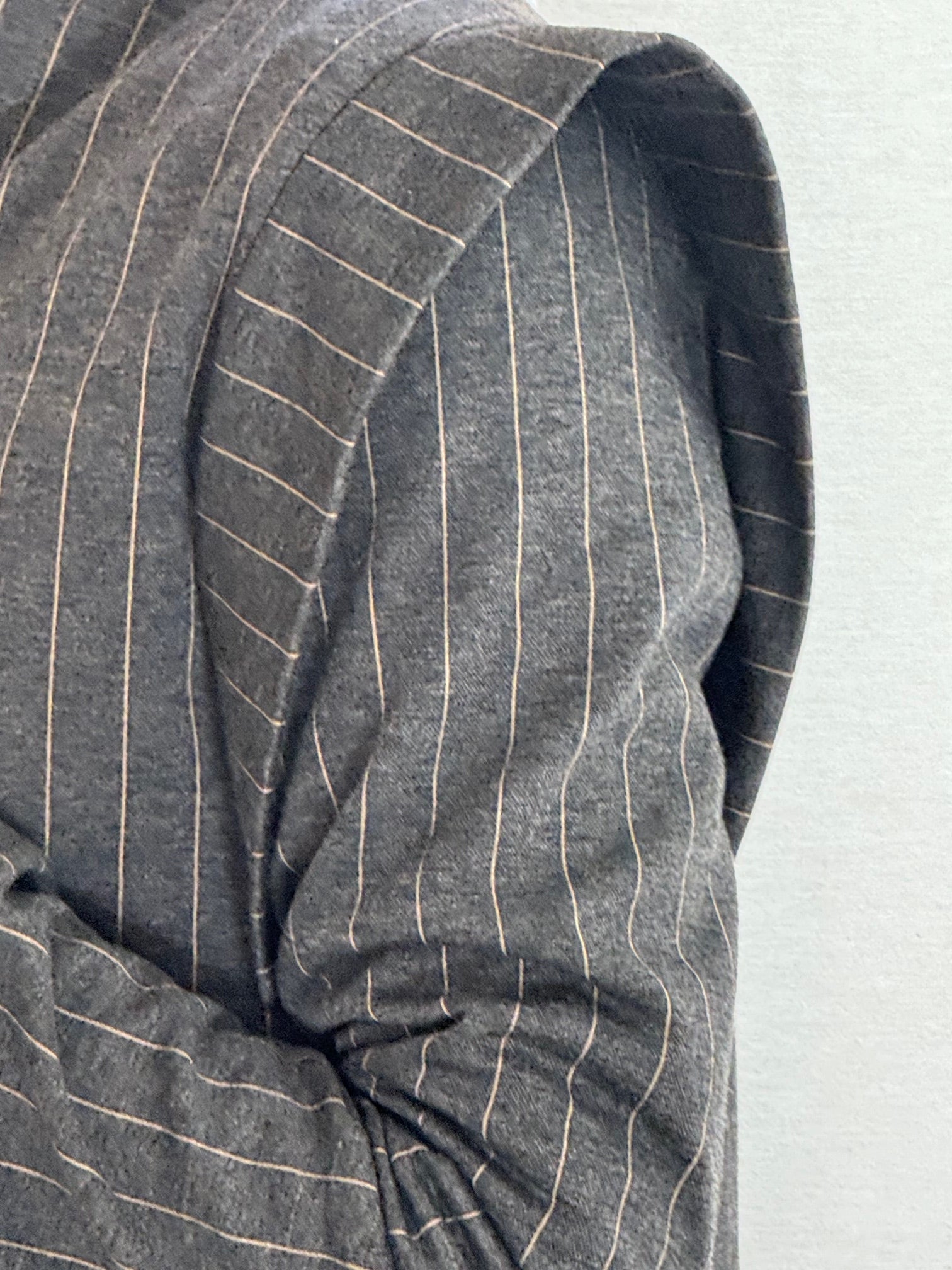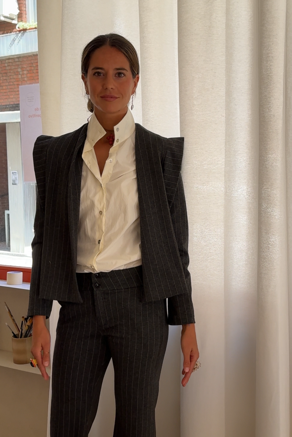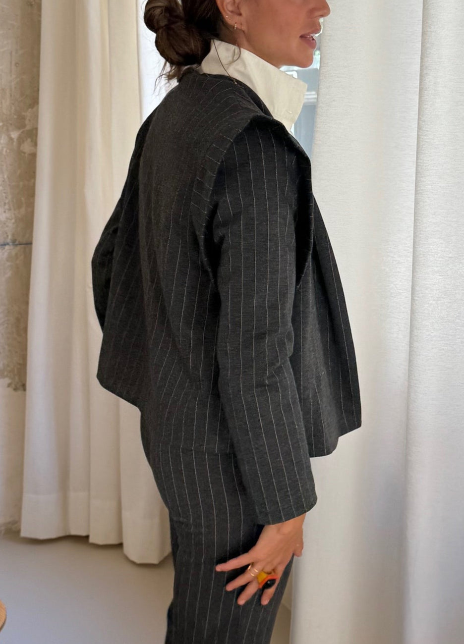 Chaqueta corta realizada en en una raya diplomática con elastán. Es una prenda de corte recto y amplio, donde destacan los alerones de los hombros que aportan volumen y estilo. Cierra con tres botones que imitan a cuero marrones. El bajo es recto y no va forrada.