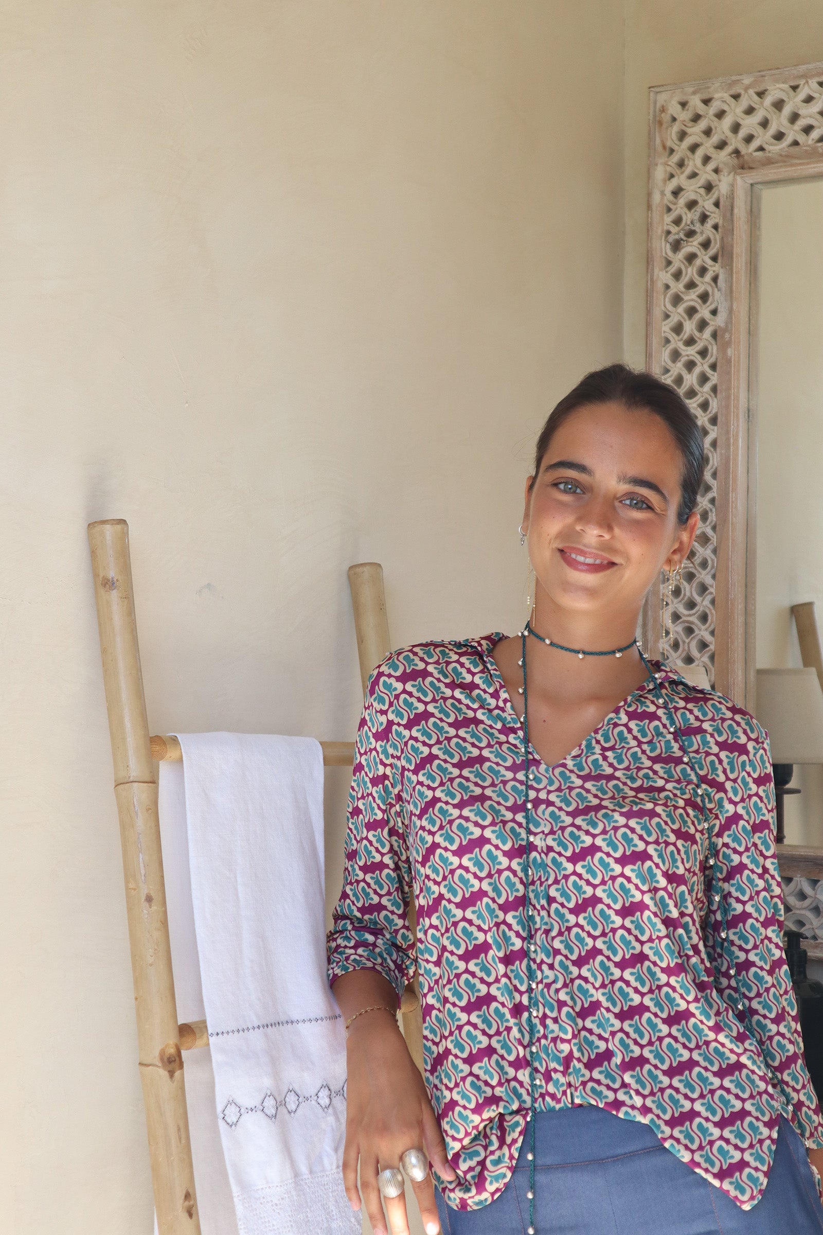 Camisa con escote en V sin botones y cuellos de pico muy pronunciados. La manga francesa es un poco tallada. Su bajo está redondeado y es un poco más corto por la parte delantera. La espalda tiene canesú con un pliegue. Está realizado en un punto con un estampado geométrico en pistacho y morado, súper cómodo, y que no necesita plancha.