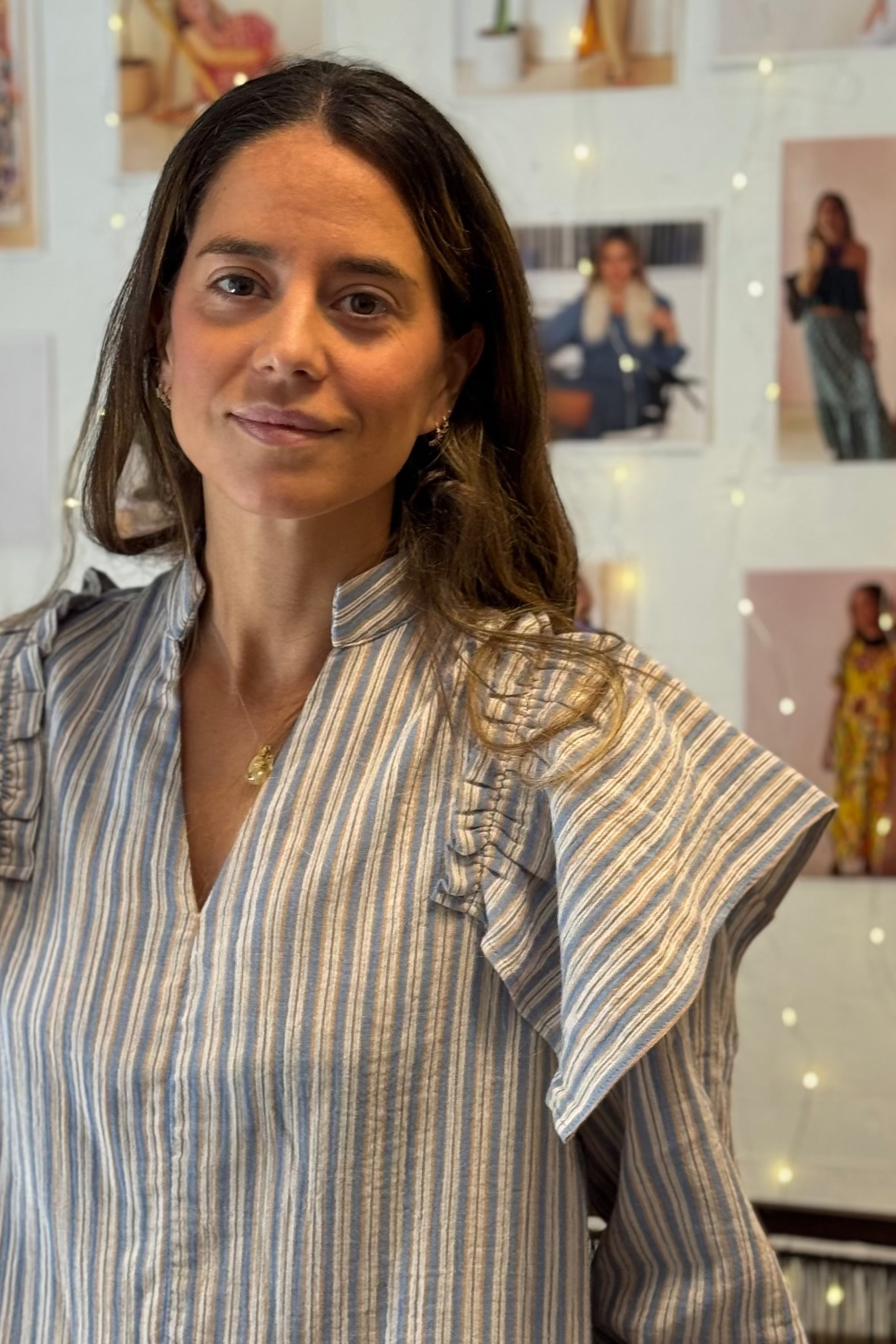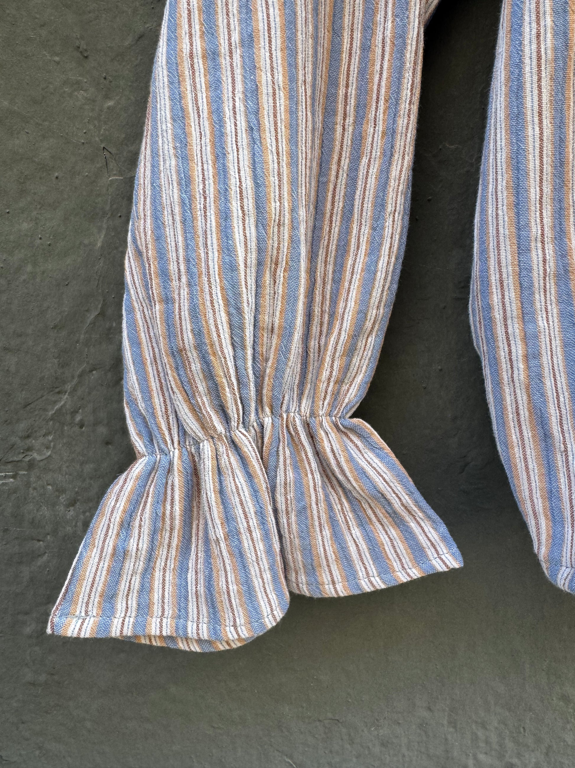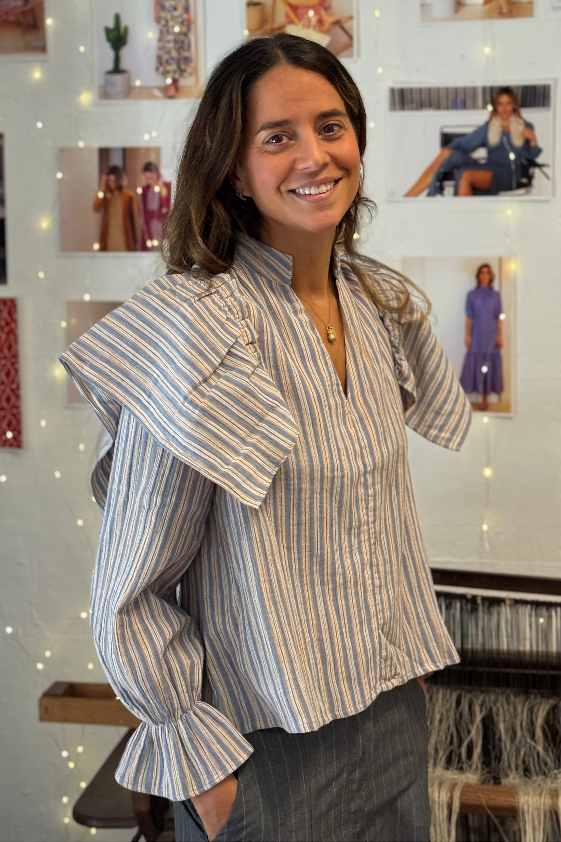 Camisa fruncida desde el hombro, con cuello mao y con dos alerones cosidos con pestaña.  Tiene una costura central delantera, canesú en la espalda y la manga larga que se remata con un volante. Está confeccionada en una bambula de algodón  de rayas azules, camel y marrón, muy cómodo ya que no se arruga y casi no necesita plancha.