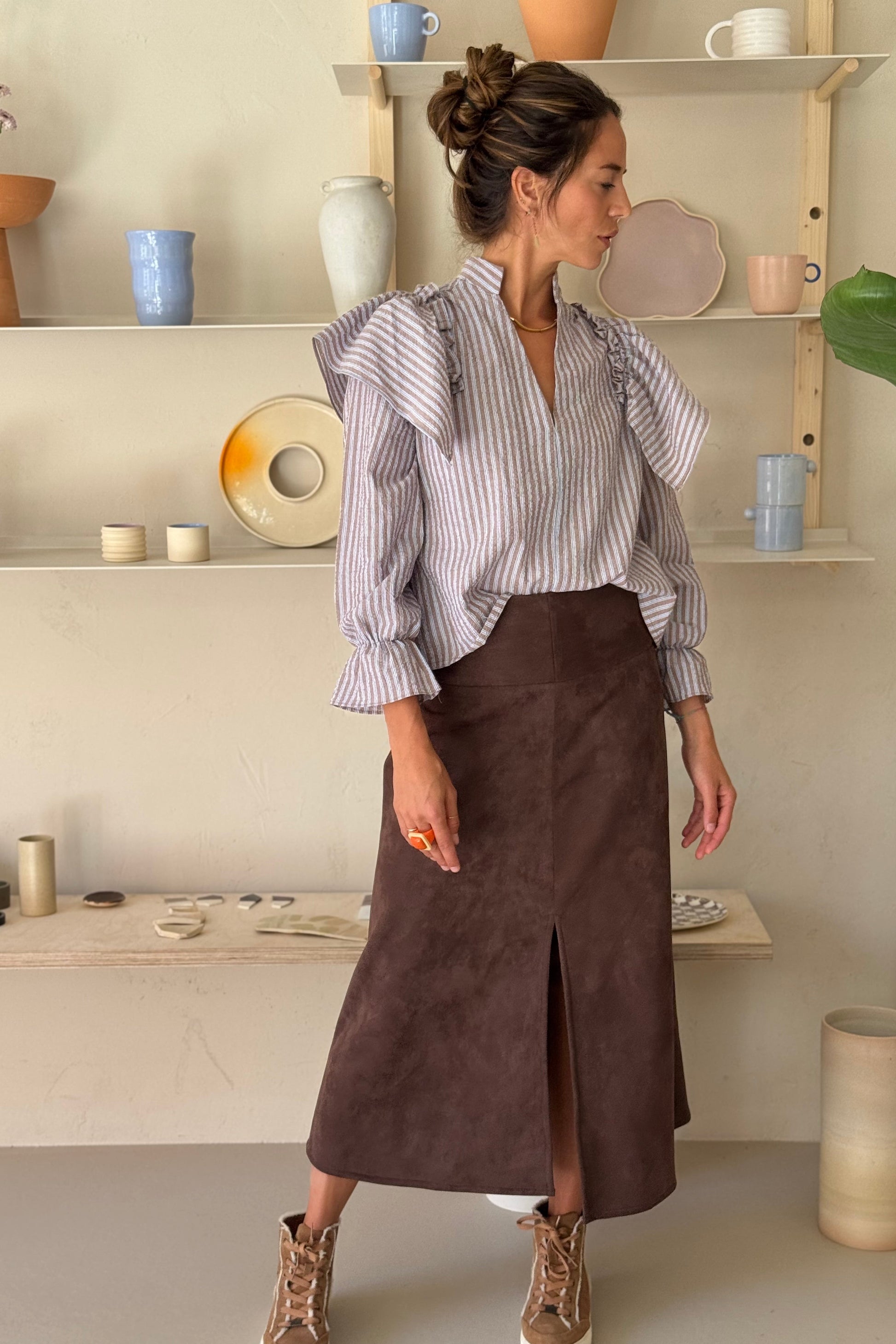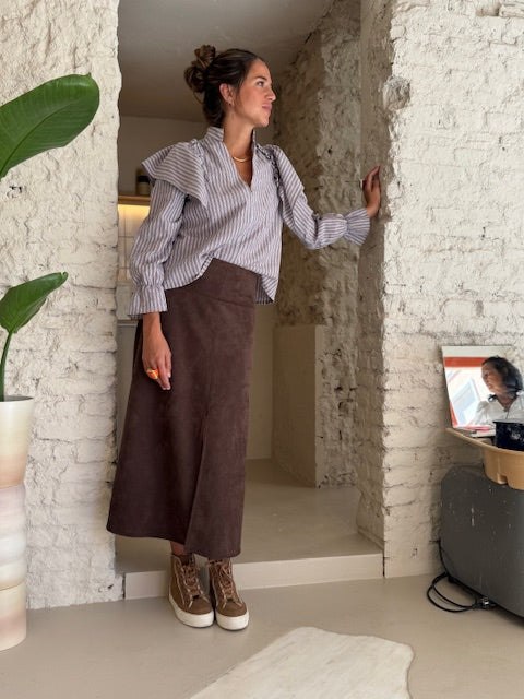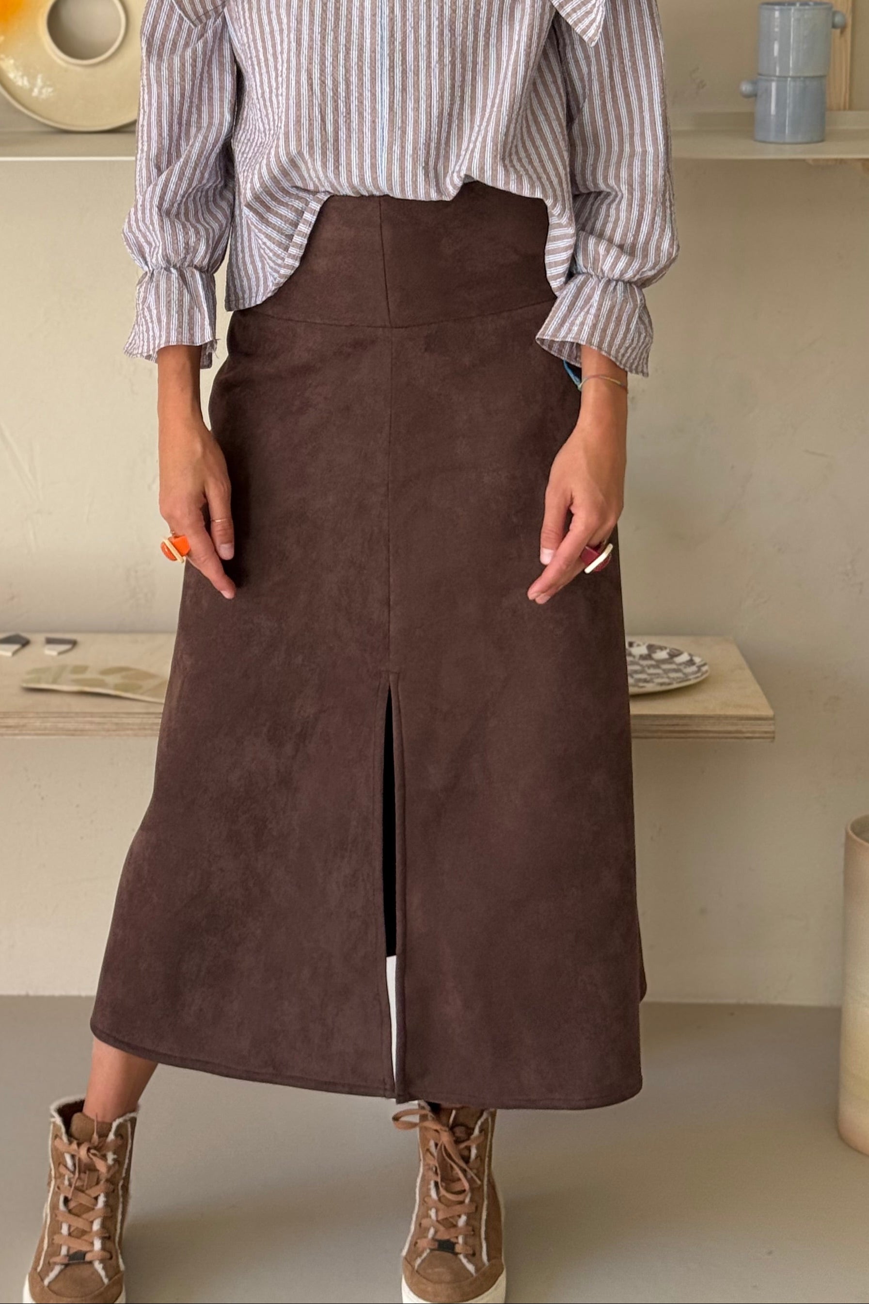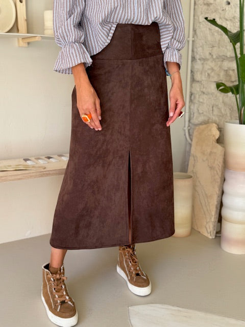 Falda midi acampanada con una cinturilla muy ancha (12 cm) que abrocha detrás con cremallera. La forma acampanada se acentúa con la abertura central de la parte de delantera. Es una falda concebida para sujetarla en la cadera. Está realizada en una antelina marrón lavable y muy agradable al tacto.