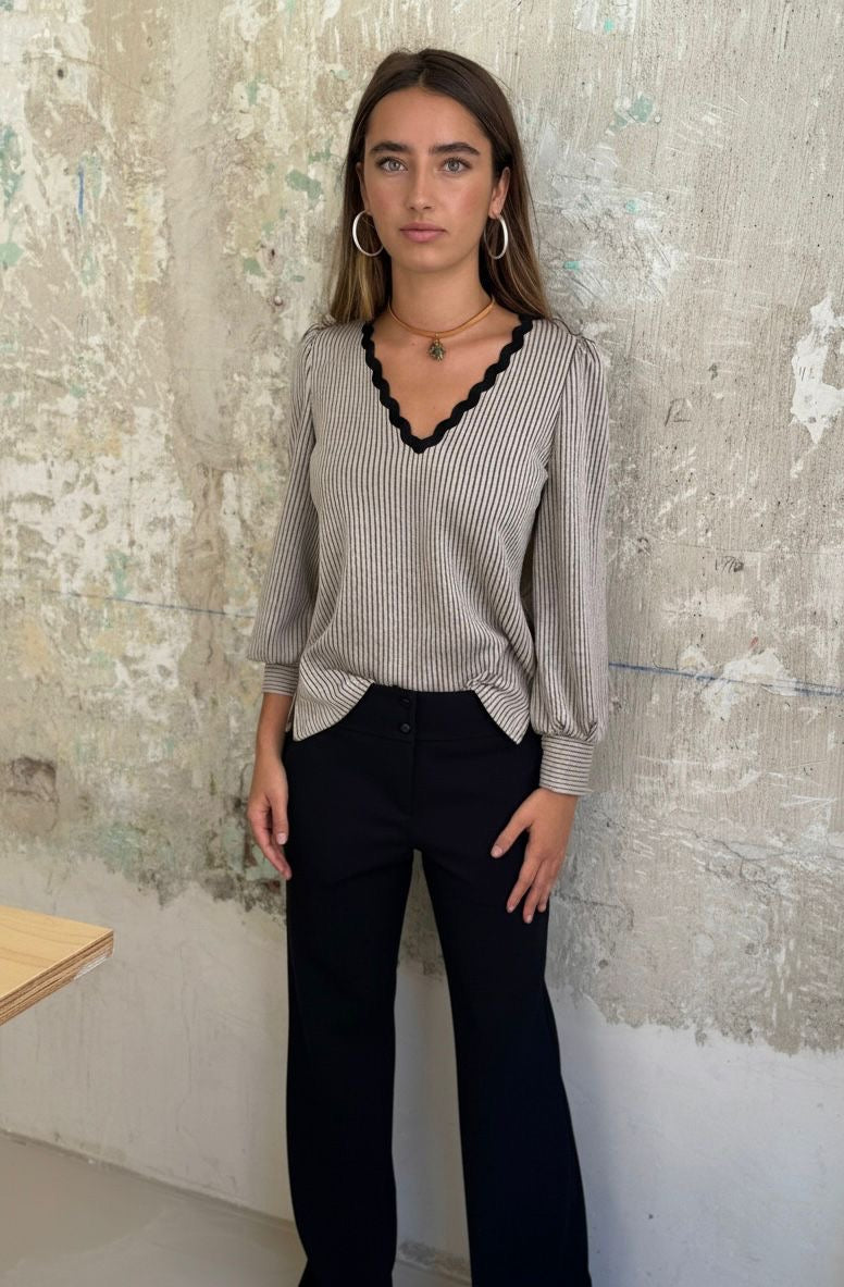 Jersey recto con cuello de pico adornado con unos picos grandes grises. Tiene las mangas fruncidas en el hombro que se rematan con unos puños anchos, de 7 cm, y ajustados. Está realizado en un punto beige con rayas grises antracita. Lo puedes combinar con la falda Edimburgo del mismo tejido disponible en la web. El bajo es recto con dos pequeñas aberturas.