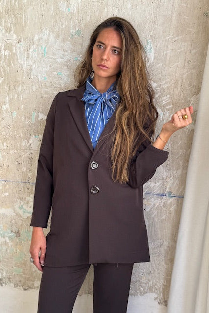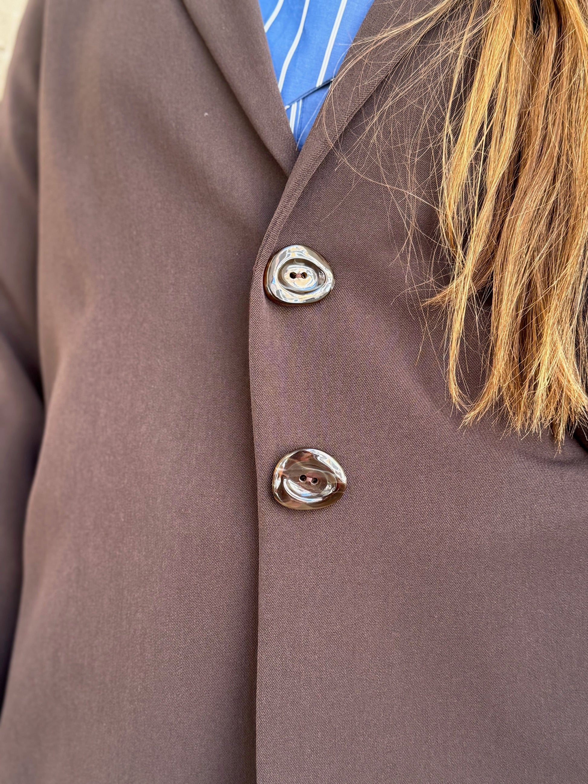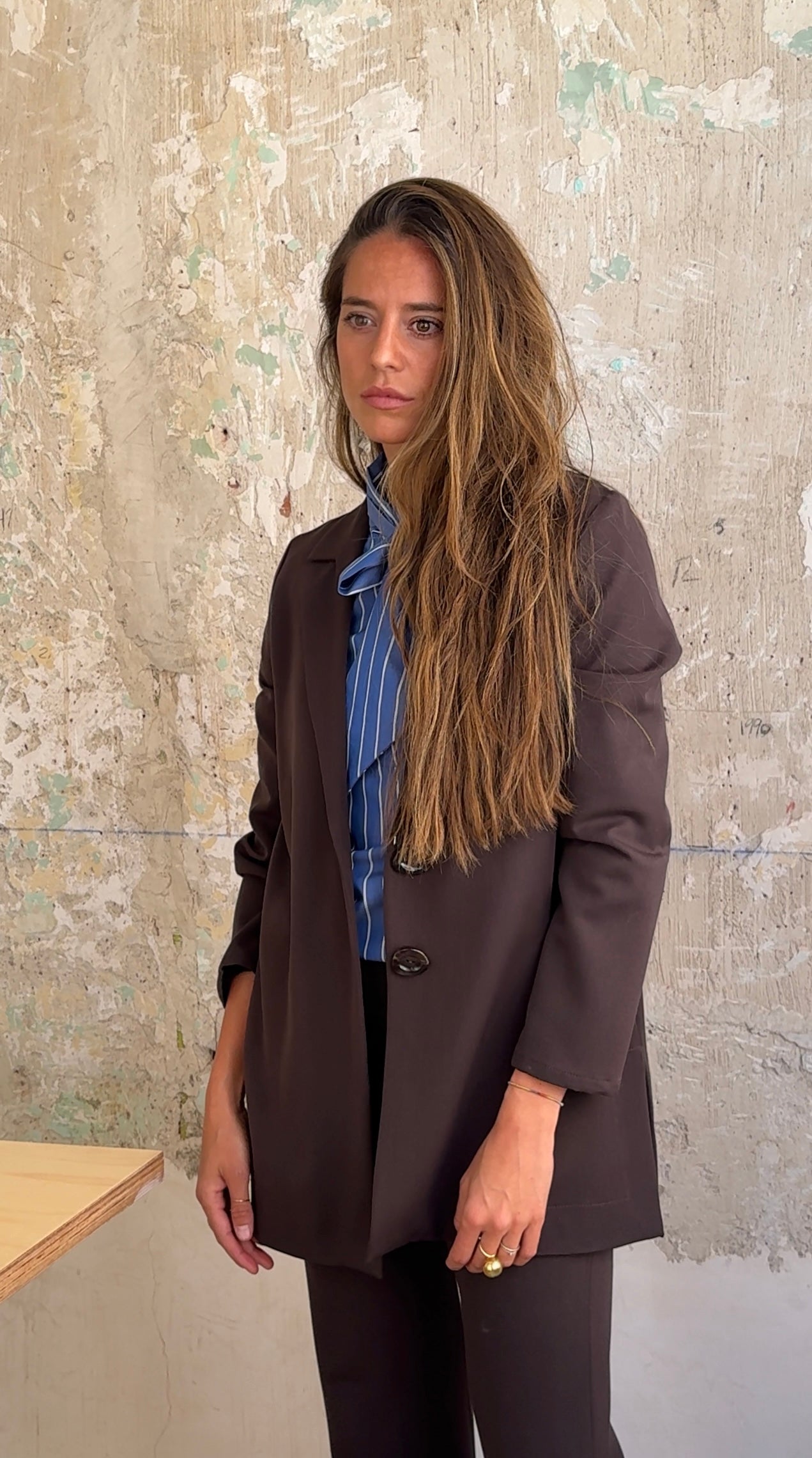 Levita realizada en gabardina elástica marrón. Se abrocha con 2 botones muy originales de pasta marrones. En los laterales se abren 2 grandes aberturas, que aportan más movimiento y dos bolsillos ocultos en la costura. Se puede combinar con el pantalón Calcuta del mismo tejido (disponible en web), consiguiendo un total look muy actual. La levita está sin forrar.