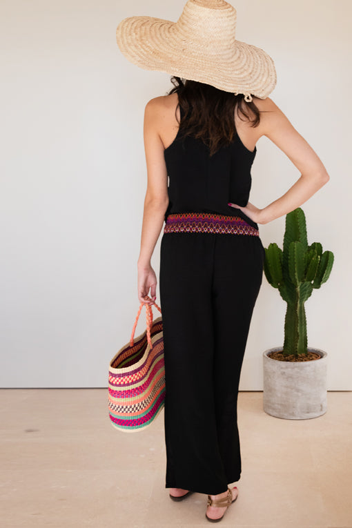 Pantalón largo, con la cinturilla de goma elástica estampada con un zig zag multicolor. A cada lado de las piernas tiene dos aberturas a la altura de la rodilla.