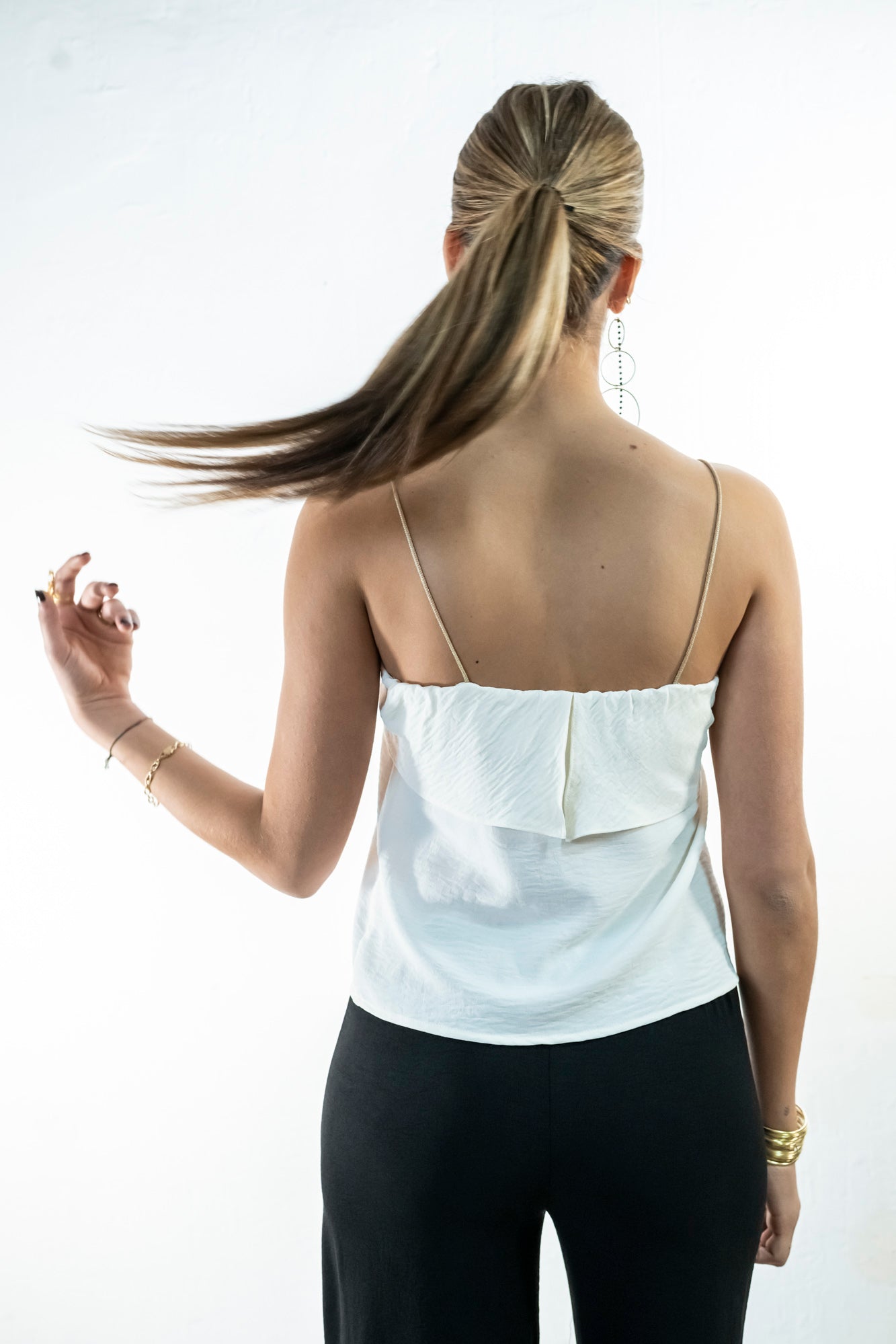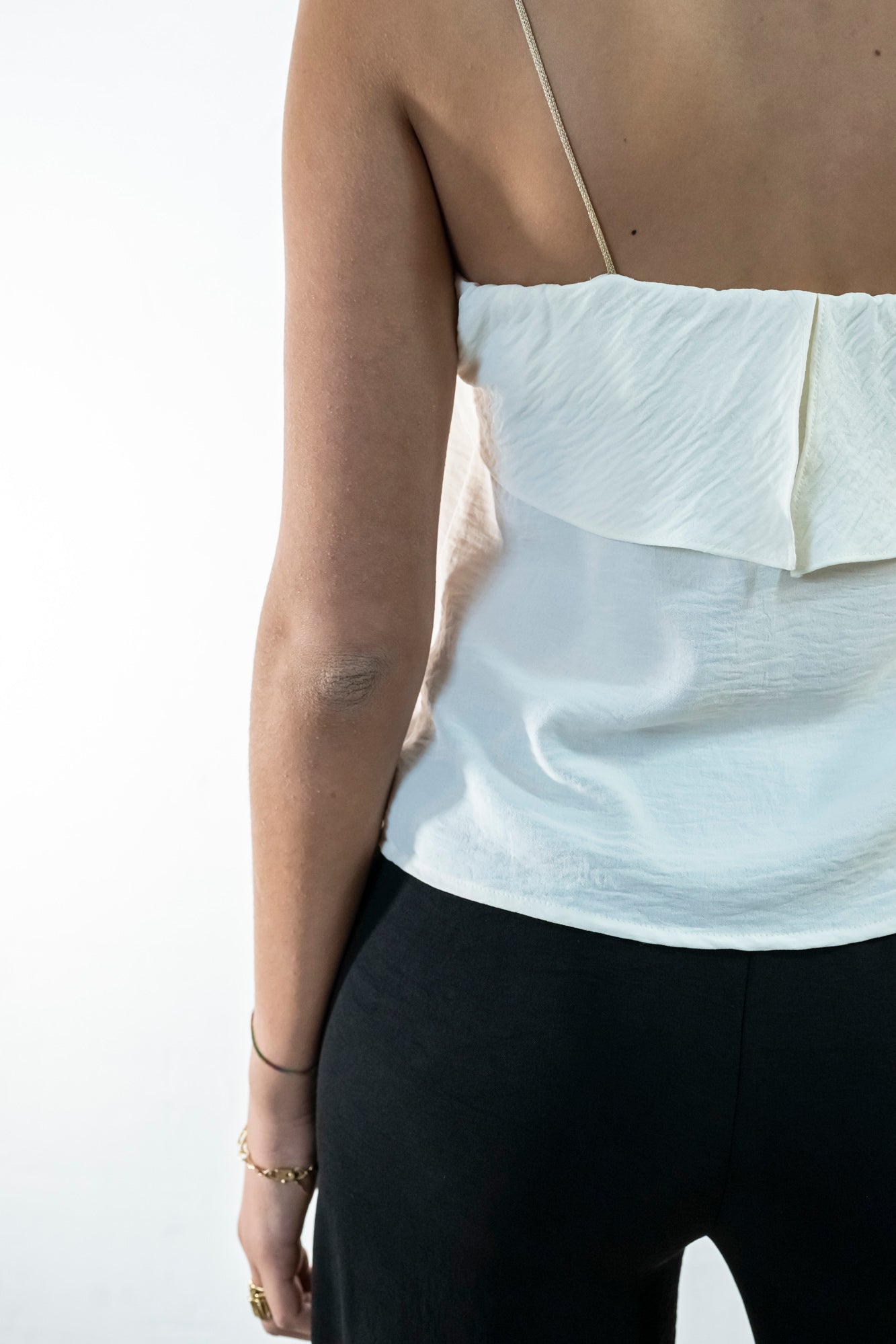 Top  recto con tirantes finos dorados. Destaca una pieza al bies, superpuesta alrededor de todo el escote, creando un movimiento sutil. Está confeccionado en un fluido marfil con mucha caída y que complementa cualquier look.