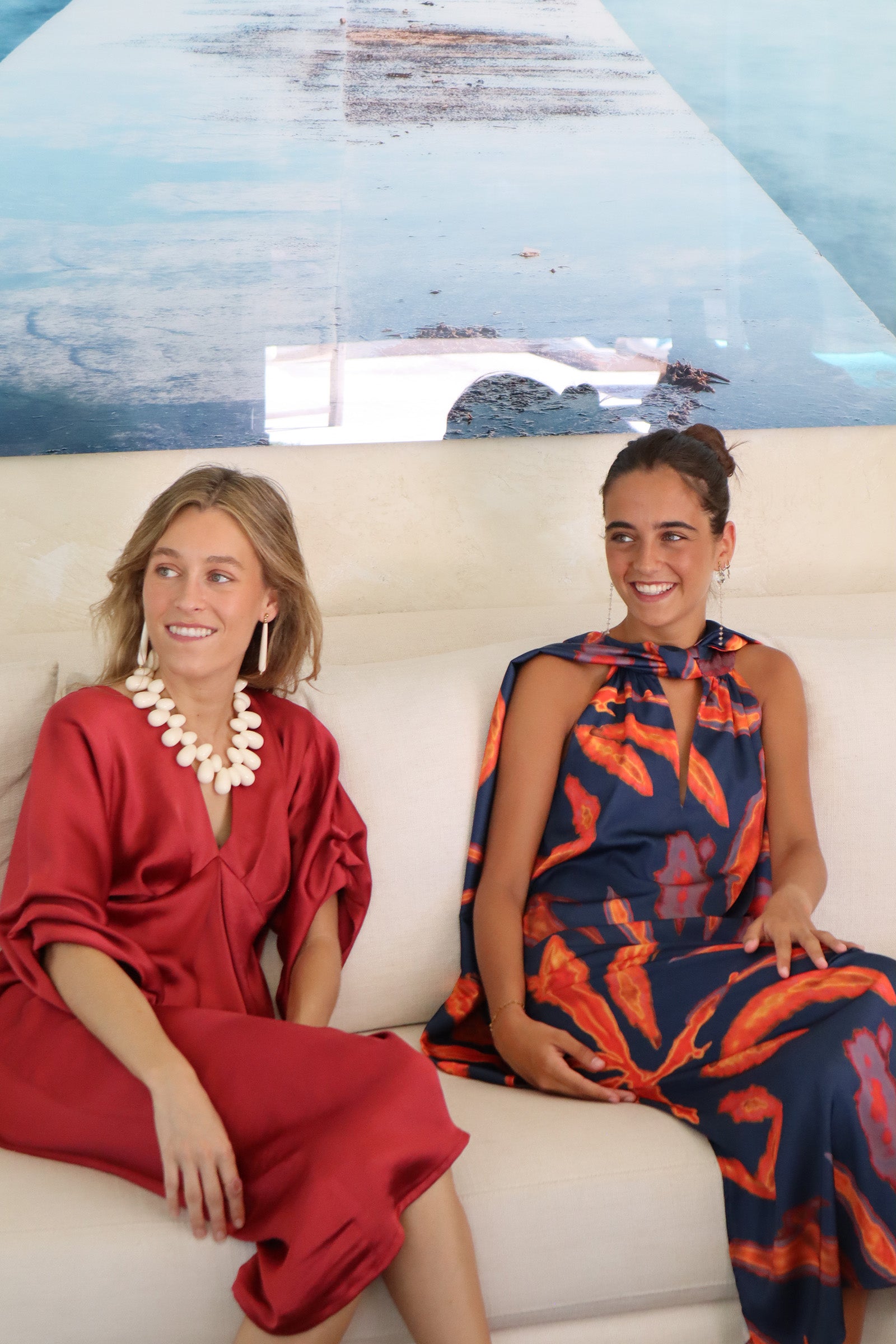 Vestido midi recto con una abertura central en el escote y con otras dos a cada lado. El vestido tiene un cuello de aro que se abrocha con una lazada por delante y con las sisas muy metidas. En la espalda, a la altura de la cintura, el vestido lleva una goma para ajustar más. Está realizado en un satinado marino con unas lenguas naranjas y va forrado al tono hasta las aberturas laterales.