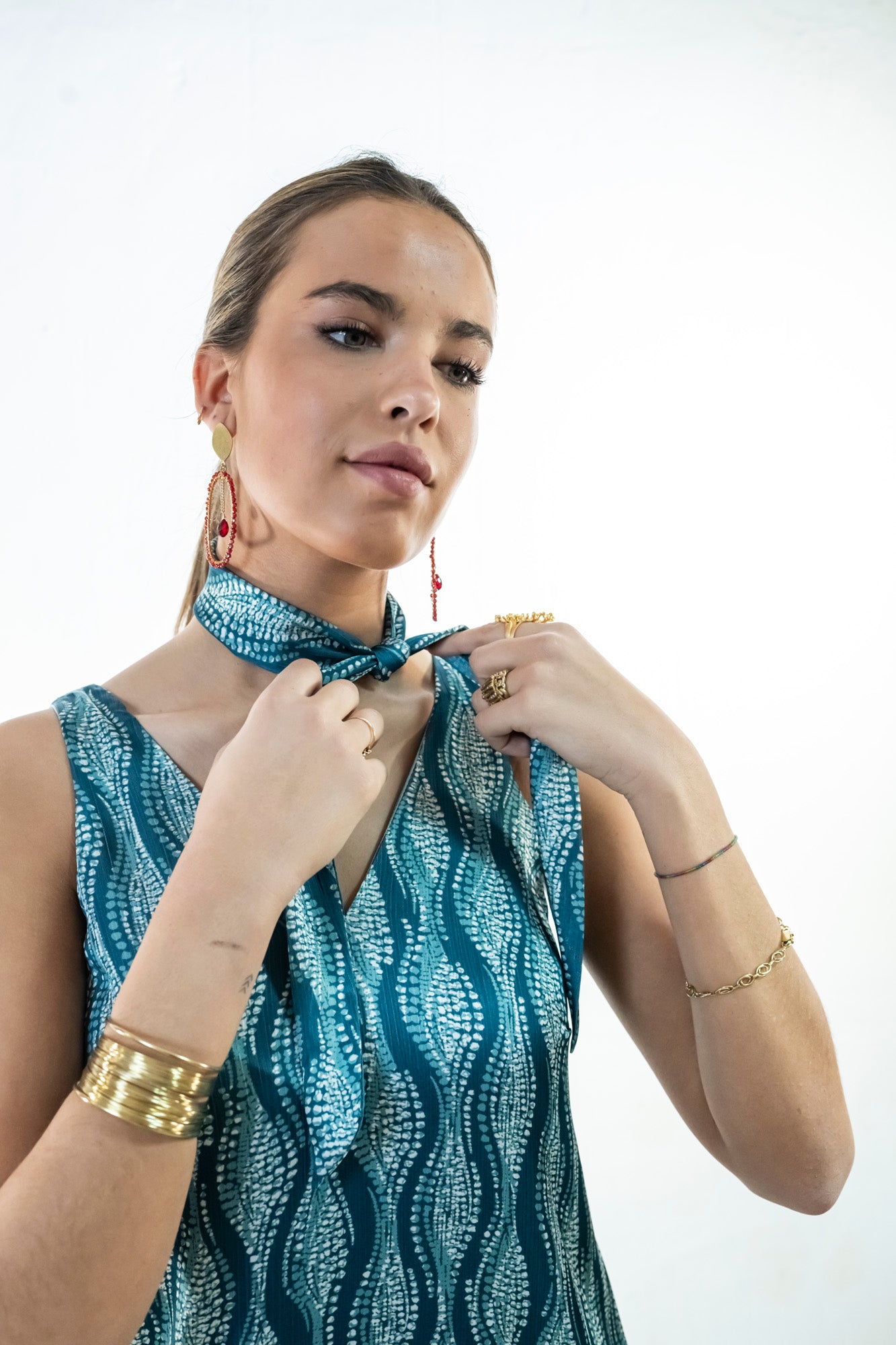 Vestido largo con escote pico delantero y trasero, con el bajo recto y  aberturas laterales. Lleva dos pinzas en el pecho para que se adapte mejor. Está realizado en una bambula  satinada con estampado de una serpentina de ochos  sobre fondo verde y  está forrado al tono hasta las aberturas. El vestido incluye una cinta para que te puedas poner al cuello, como cinturón o en el pelo.