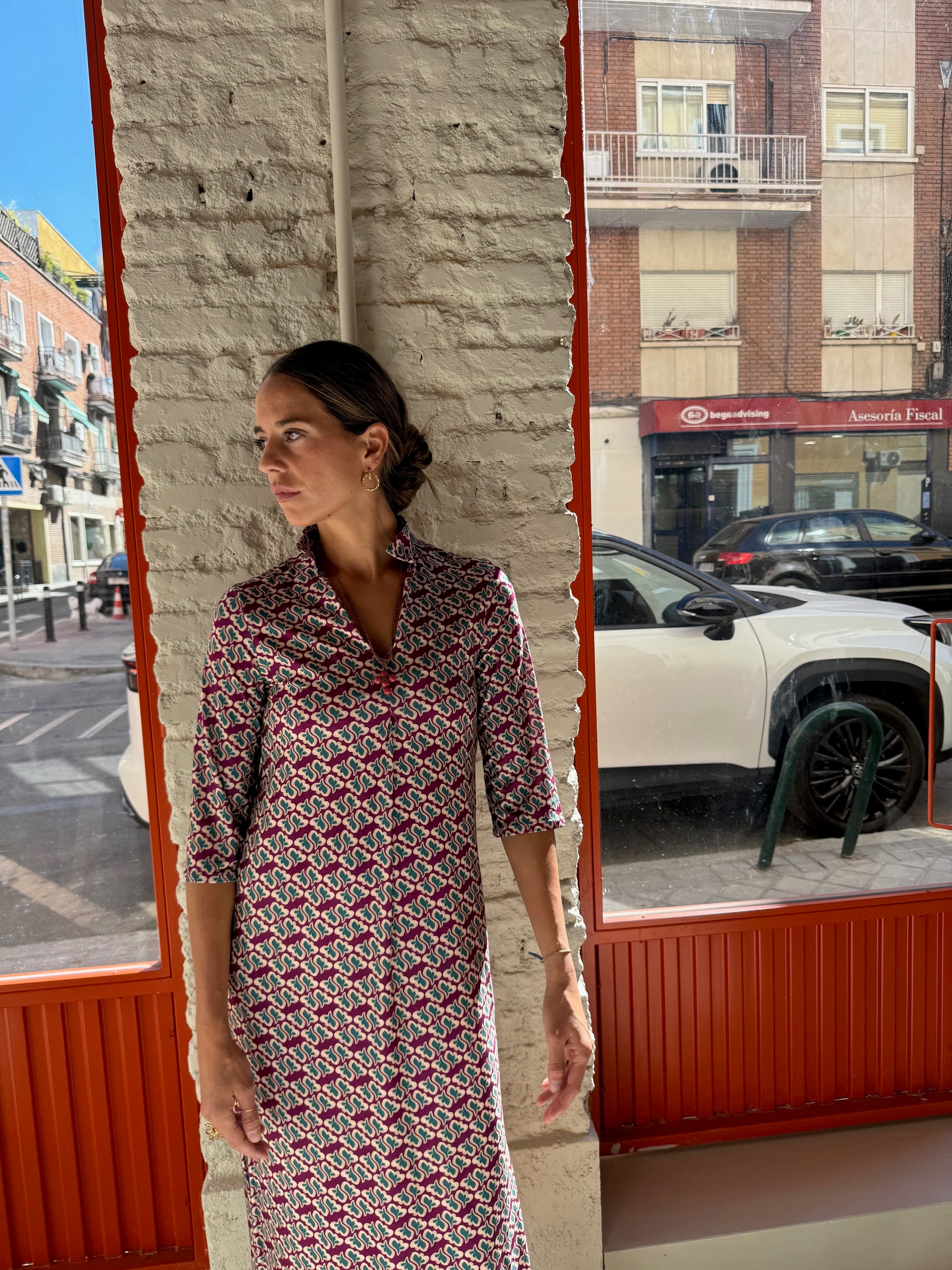Vestido suelto y recto con escote de pico y cuello mao. Tiene las mangas largas y rectas que terminan en puño con goma. La espalda tiene canesú. Es un vestido muy cómodo por su patrón y tejido de punto estampado. Además tiene dos aberturas laterales a cada lado.