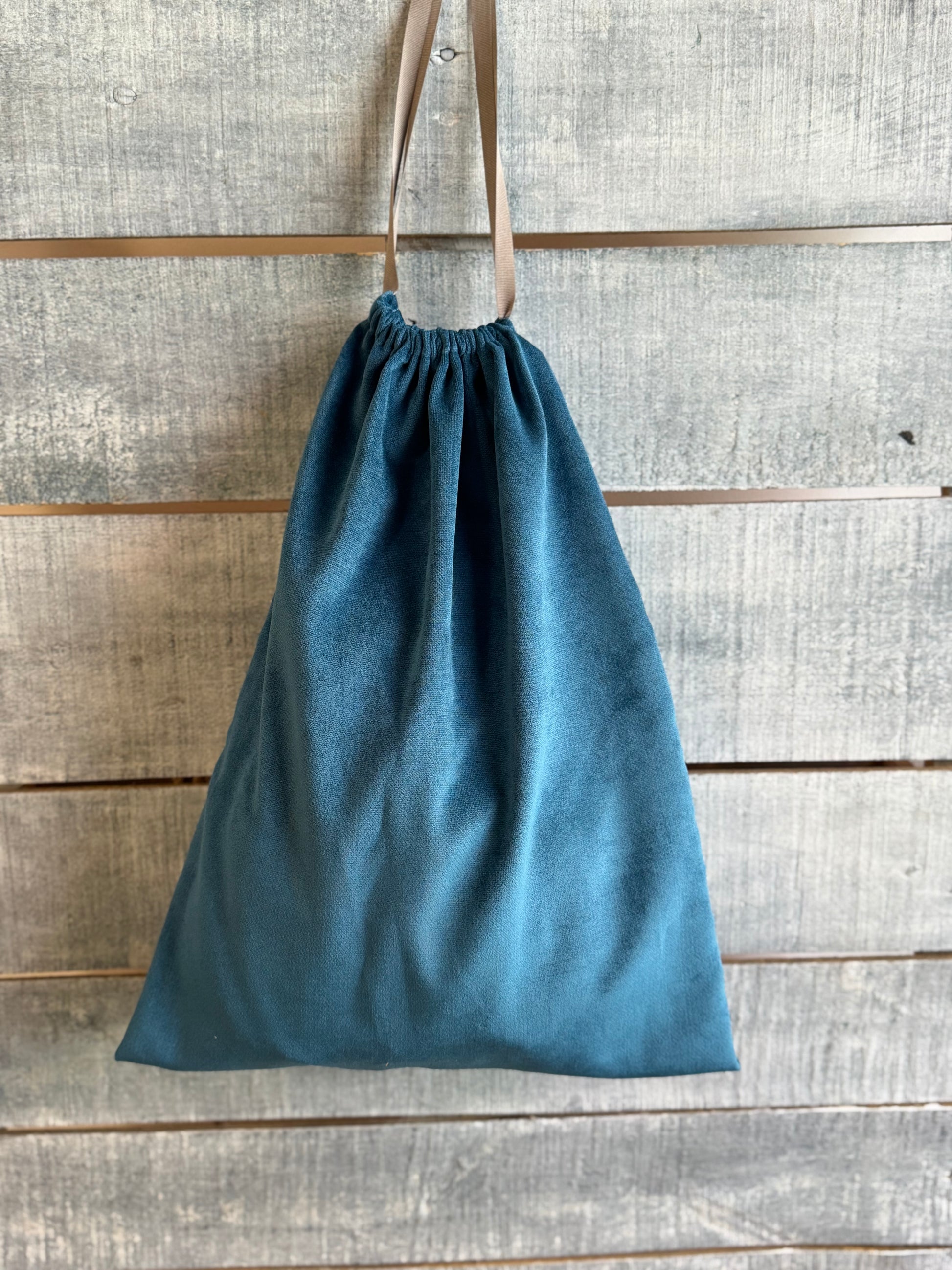 Bolsa con forma de saco de terciopelo en color turquesa con el cierre de cintas en color topo. Es una bolsa ideal para llevar a bodas o eventos especiales, perfecta para guardar tus zapatos de repuesto, el abanico, chal u otros accesorios de una forma elegante.